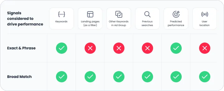 The Google algorithm is increasingly embracing automation. Broad match expands reach and Smart Bidding achieves goals within this reach. This combination allows the algorithm to use unique signals which aren’t available in exact or phrase match.