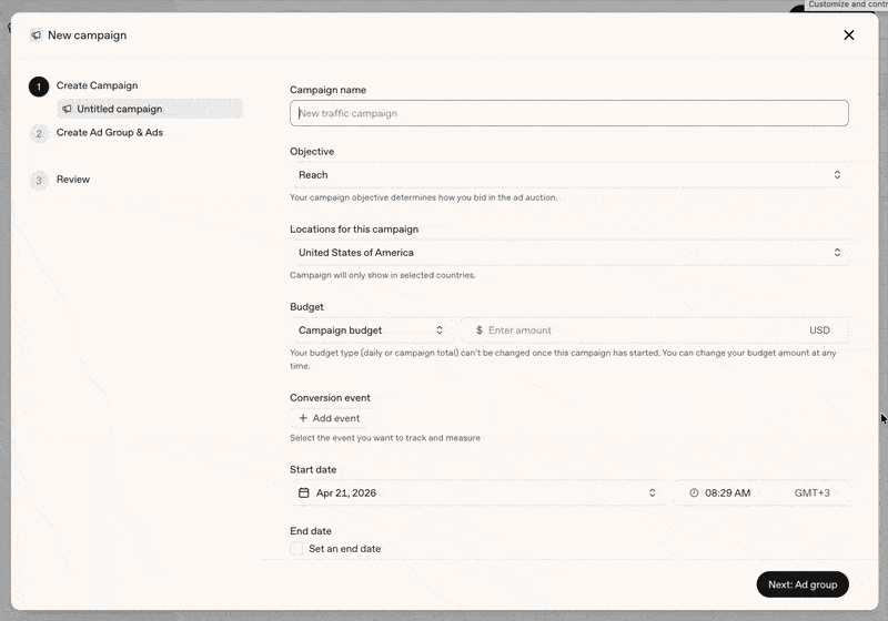 Rozhraní umožňuje inzerentům vybrat si mezi dvěma cíli kampaně, Dosah nebo Kliknutí, a poté zadat maximální CPC nabídku. Navrhované rozmezí nabídek se pohybuje mezi 3 a 5 dolary, což je číslo, které již v oboru vyvolalo diskusi.