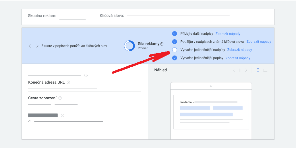 Síla reklamy je nástroj přímo v Google Ads, který hodnotí kvalitu a variabilitu vašich responzivních reklam.