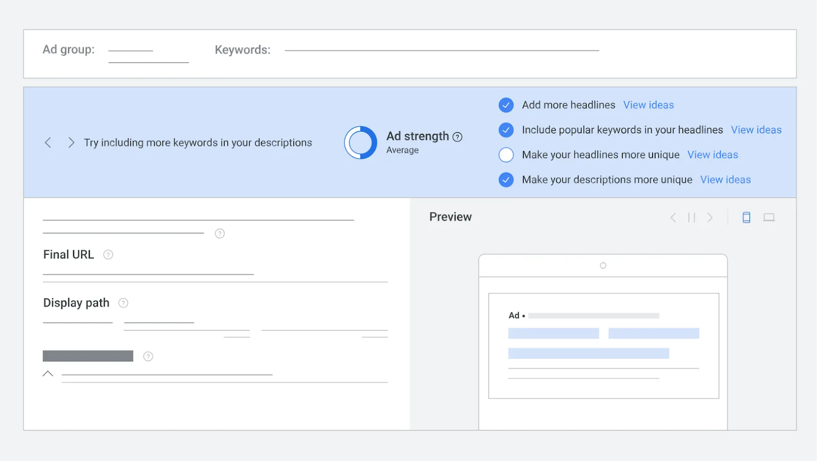 Ad Strength is Google’s built-in tool to evaluate the quality and variety of your responsive search ads (RSAs). It gives two key things: