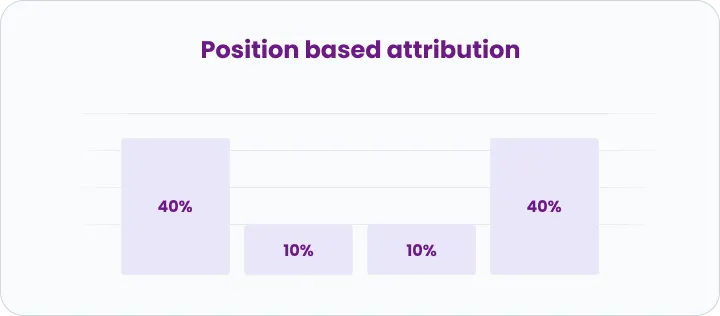 The position-based attribution model gives credit to several points of contact throughout the customer journey. It focuses on the first and last interactions but also takes into account the impact of interactions that happen in between. Typically, this model assigns 40% credit to both the first and last touchpoints, while the remaining 20% is distributed among the middle interactions.