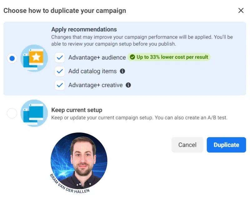 Meta now includes recommended checkboxes when duplicating campaigns, promoting âAdvantage+ audienceâ targeting and âAdvantage+ creativeâ. Advertisers can streamline campaign setup and optimization by leveraging recommended settings, enhancing ad performance and audience engagement. (source)