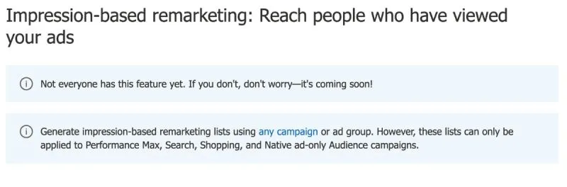 Microsoft introduces Impression-Based Remarketing, utilizing first-party cookies to target users who have previously viewed ads. Automatically generated audience lists enhance campaign performance by boosting clicks and conversions, optimizing bids, and leveraging protected first-party data. Advertisers can create impression-based audiences under Tools -> Audiences, selecting the âImpression-basedâ type for enhanced targeting capabilities. (source)
