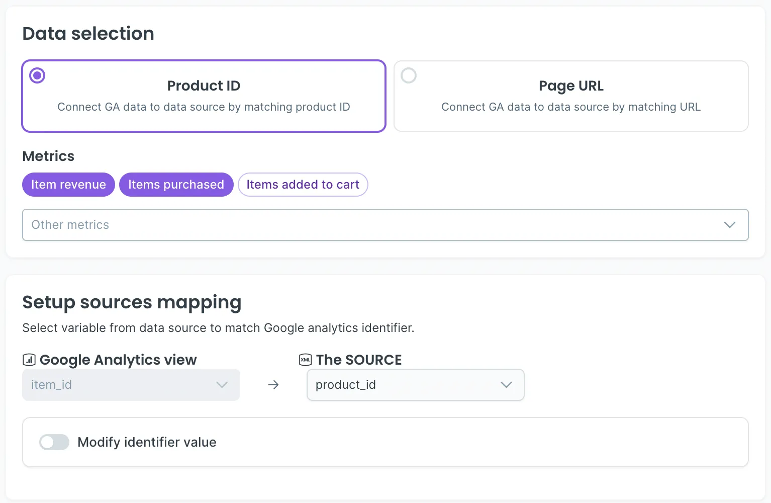 Choose your Google Analytics 4 account and, in the “Data Selection,” select the “item purchased” and “item revenue” metrics.