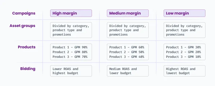 The structure is built on tiers of gross profit margin (GPM%). Each tier gets its own campaign with a specific ROAS target:
